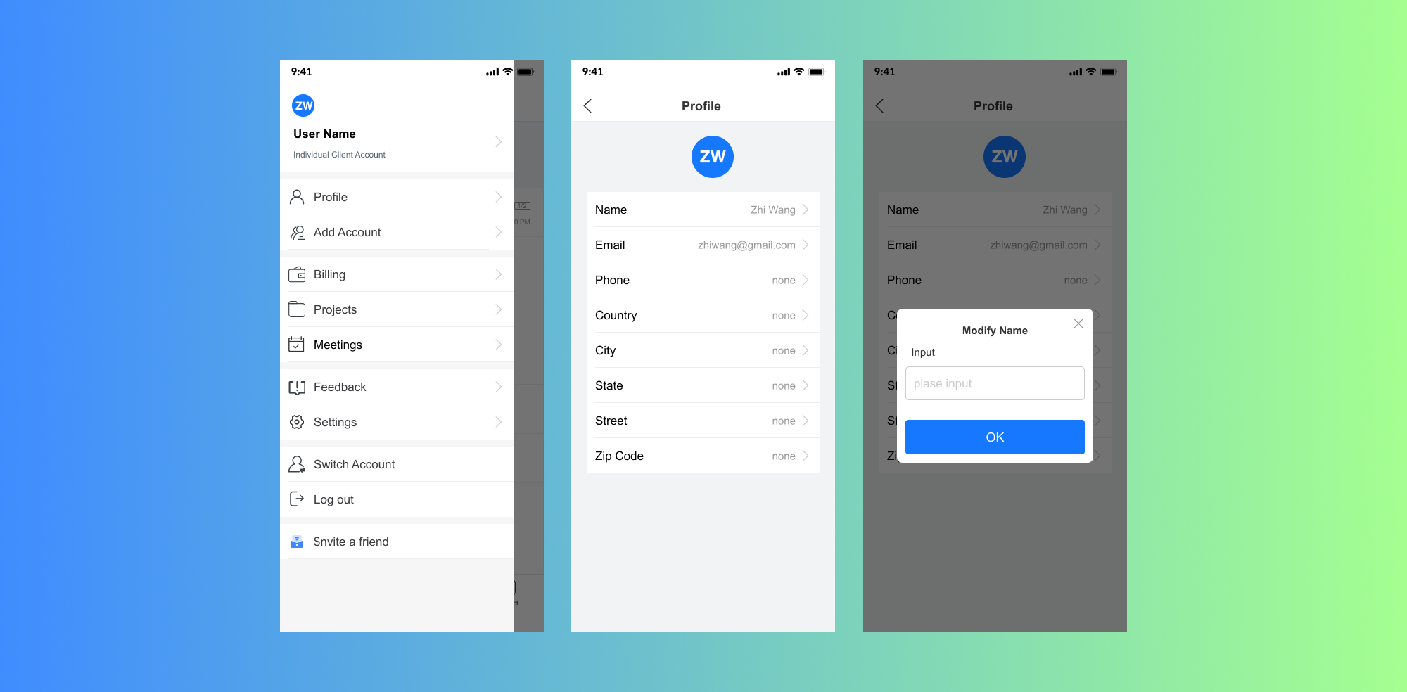 Modify Name: Tap the Name field to update it. A pop-up form will appear. Enter the new name and tap OK to save. Edit Email or Phone: Tap the respective fields (Email, Phone) to update your contact details. Add Address Information: Update details like Country, City, State, Street, and Zip Code by tapping on each field.